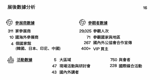 这些展览巩固了台湾作为全球五金、精密加工、工安职安(工业安全与职业安全)与冷冻空调领域优质供应来源的声誉。到目前为止,已有超过5000家参展商和50万名专业买家参与过这一盛会,并在展会中找到了潜在客户并促成了订单。